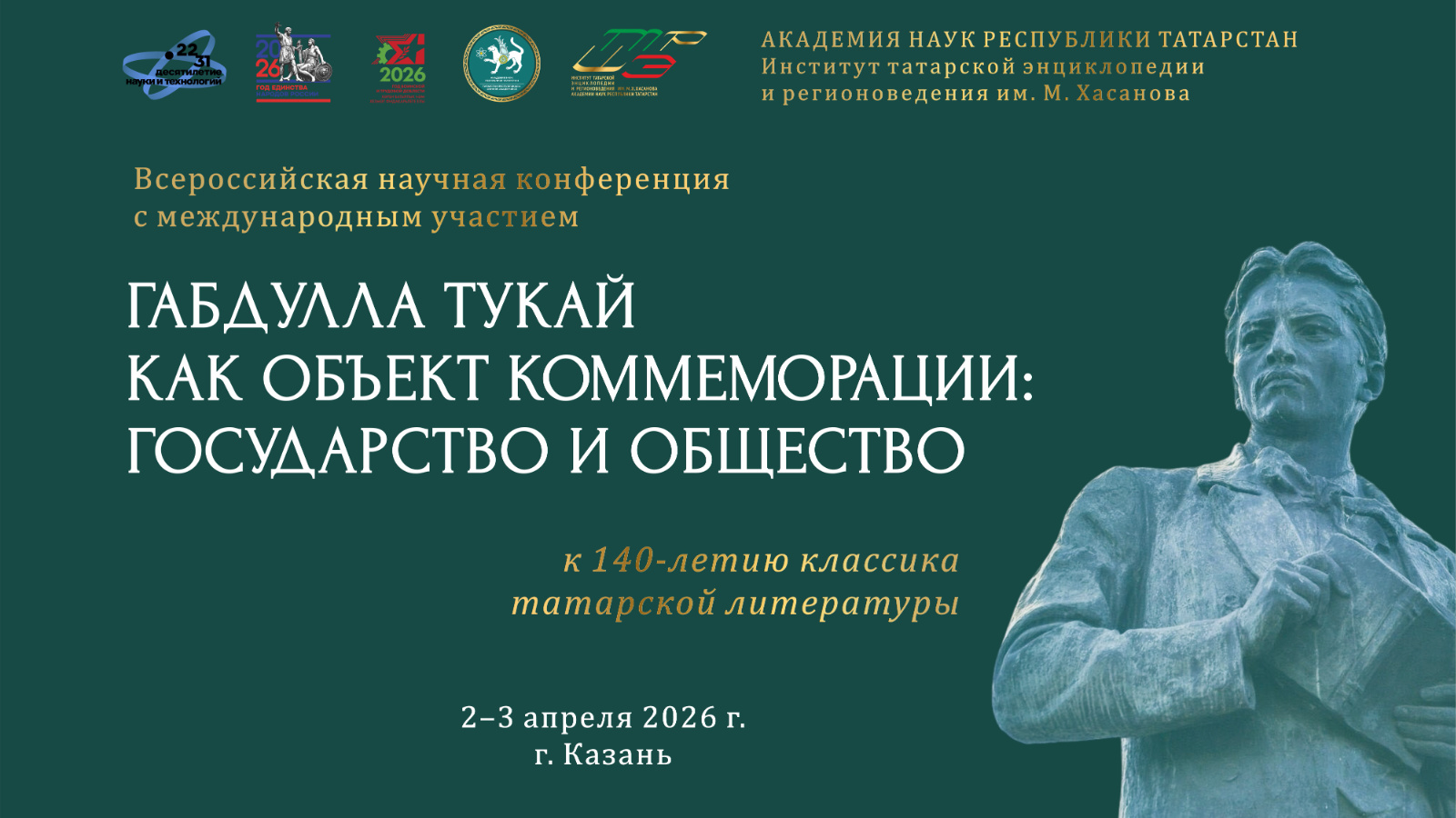 Институт татарской энциклопедии и регионоведения им. М. Хасанова АН РТ приглашает Вас принять участие во Всероссийской научной конференции с международным участием «Габдулла Тукай как объект коммеморации: государство и общество», которая состоится 2–3 апреля 2026 г. в Академии наук Республики Татарстан (г. Казань).